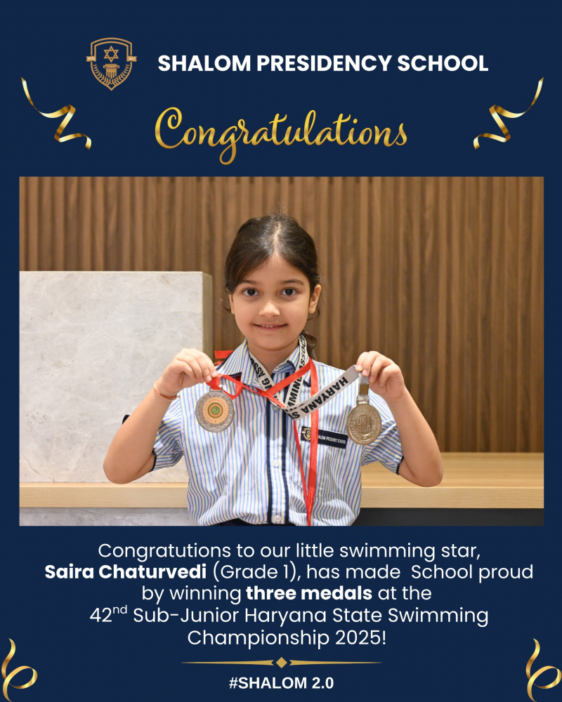 We are proud to share that Saira Chaturvedi brought glory to Shalom Presidency School by winning three medals at the 42nd Sub-Junior Haryana State Swimming Championship.
