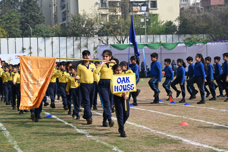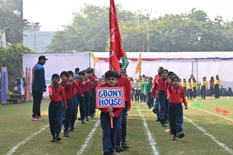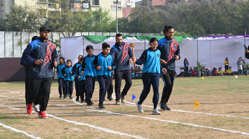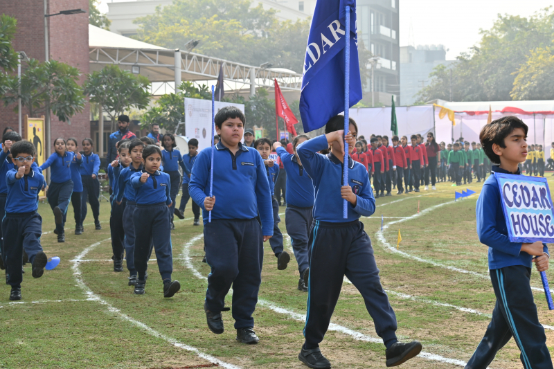 The day began on an energetic note with a Zumba session for parents, setting an atmosphere filled with enthusiasm and cheer. The occasion was graced by the presence of the Founder, Dr Mrs. Lilly George and our Sherpa & Vice Chairman- Mr Dennis George, whose encouragement added prestige and inspiration to the event. The ceremonial lighting of the torch by our revered Founder Ma’am, marked a symbolic beginning, representing perseverance and excellence. This was followed by a dignified torch run by the Sports Achievers of Session 2025–26 and the release of balloons, symbolising unity and aspiration. The Sherpa & Vice Chairman Sir then officially declared the meeting open. A disciplined March Past by Grades III and IV and the Oath Taking Ceremony highlighted coordination, commitment, and team spirit.